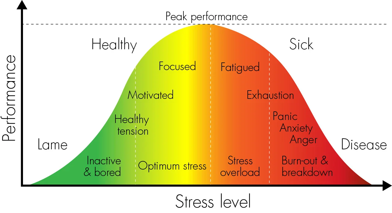 **Before reading the examples, look at this graph. Notice that there is an optimal amount of stress that leads to peak performance. Beyond this optimum level of arousal, the body begins to fatigue and the negative effects of stress set in.